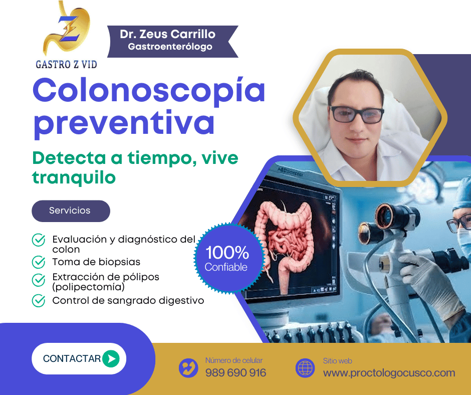 👨⚕️ Bajo la dirección del Dr. Zeus Carrillo – Gastroenterólogo en Cusco, recibirás una evaluación segura, precisa y enfocada en tu bienestar.